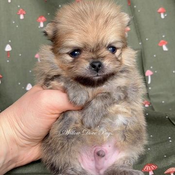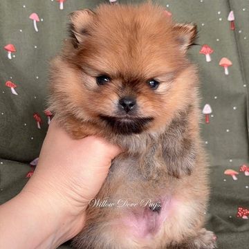 Purebred Pomeranian from imported champion sired parents. Whisky is a handsome male who appears to be either a developing orange or a cream. He is currently charting to be just 4 pounds. Whisky will have a short muzzle, round head, and compact body! His personality is still forming but he's expected to be super friendly, loving, brave, and playful. He should be ready Jan 24th.